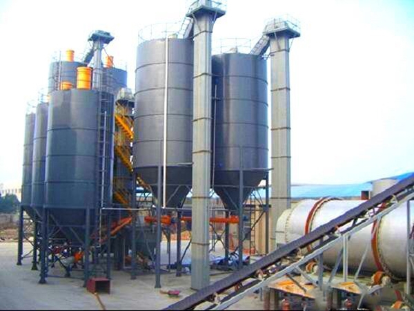 干粉砂浆生产线中用于储存大宗原料,如水泥、粉煤灰、砂。本案采用国内常用50吨或100吨水泥仓(客户选型)作为原料仓,一般采用水泥、粉煤灰、砂子三种原料仓。水泥、粉煤灰采用槽罐车上料,砂子采用斗式提升机上料。